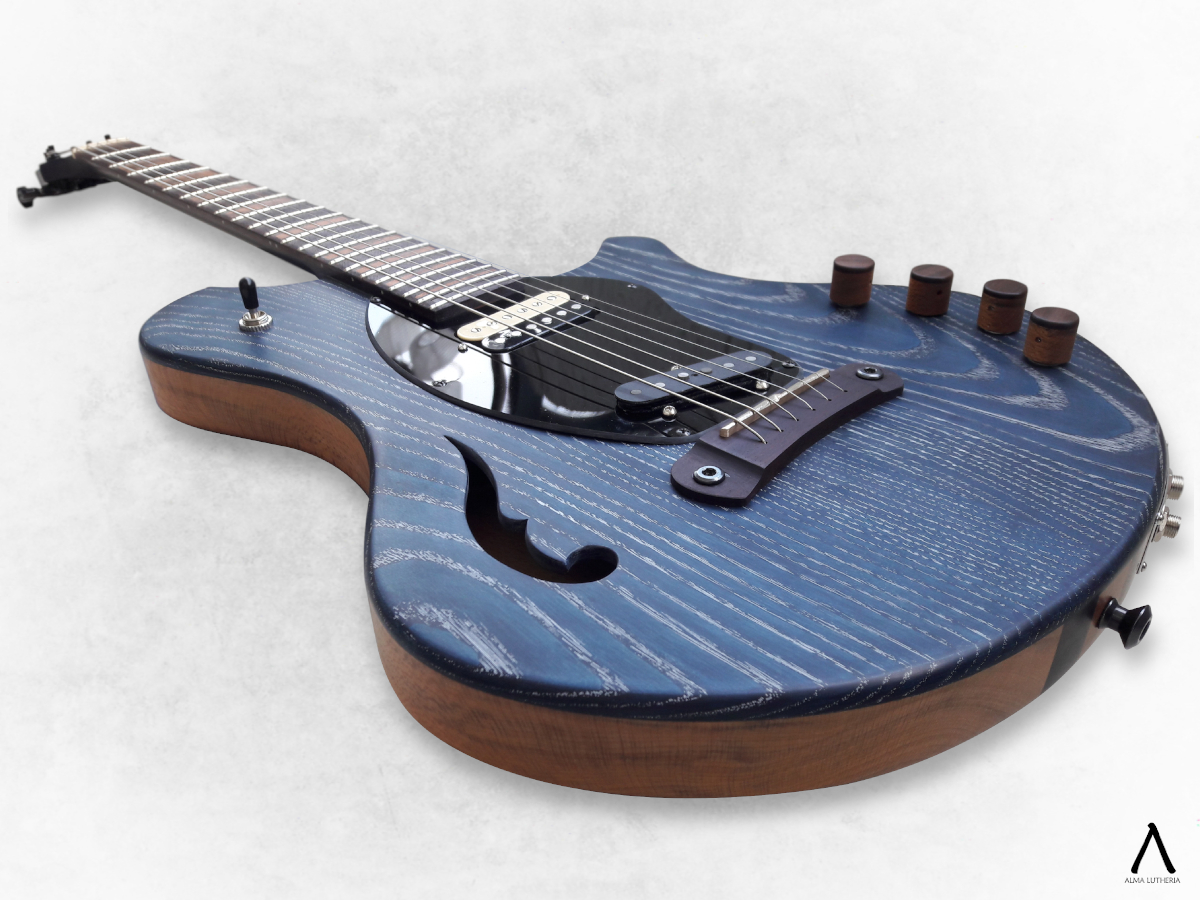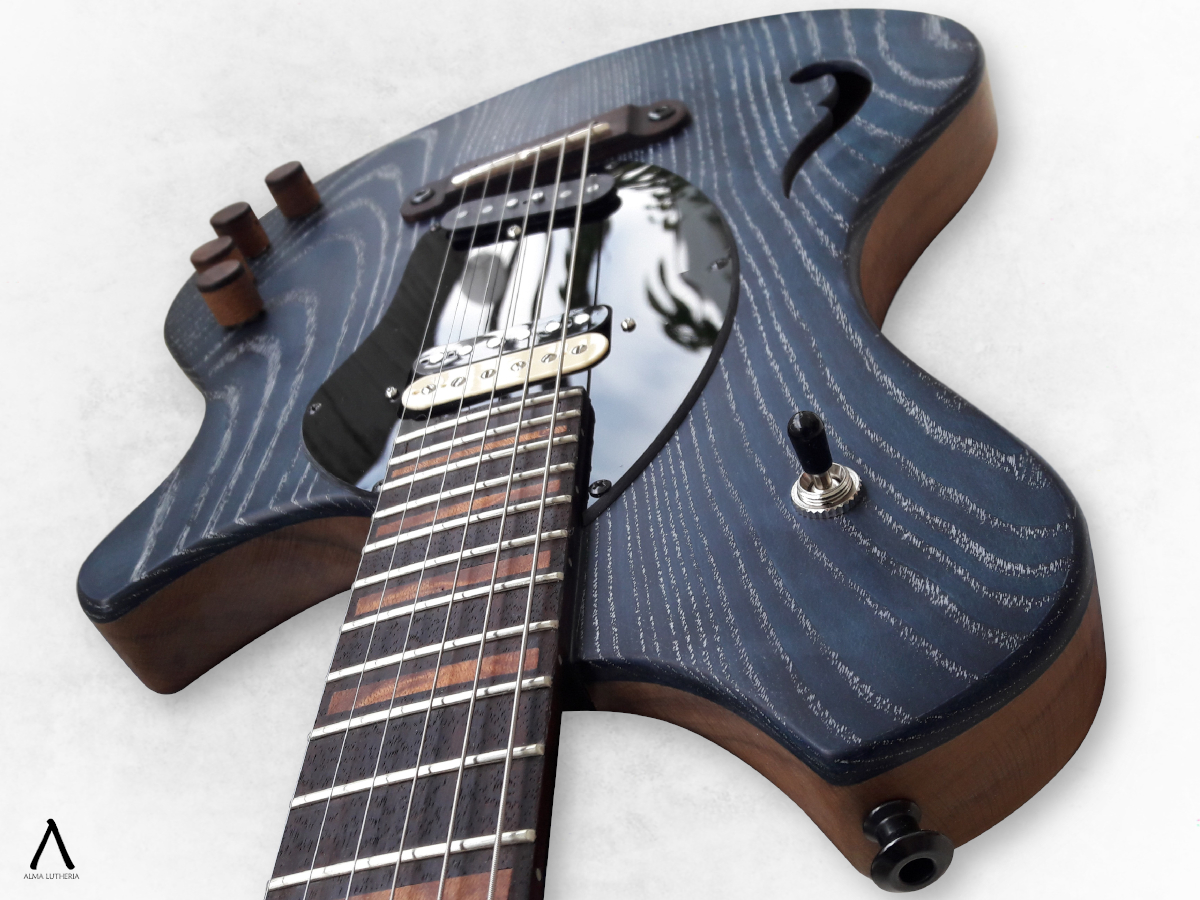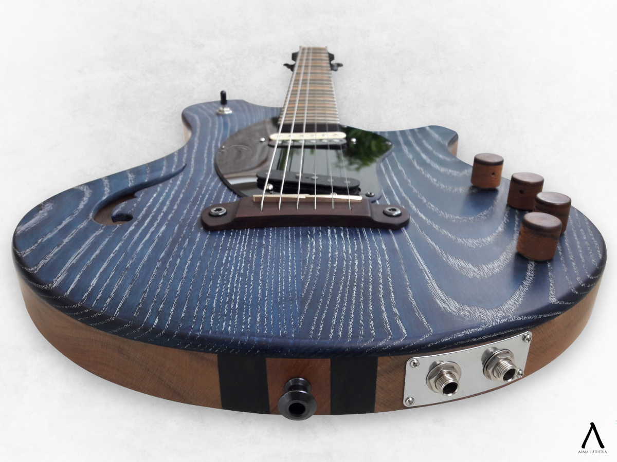 La inquietud que dio origen a este proyecto fue que en ese momento Seba estaba intentando incluir más la guitarra eléctrica en su repertorio, pero al estar más acostumbrado a la acústica le incomodaba la separación de cuerdas para su forma de tocar por lo que no estaba conforme con el resultado técnico ni sonoro que estaba logrando. Entonces partimos pensando un instrumento que le acomodara en ambas manos, agrandando la separación de cuerdas, pensando en que las cápsulas no estorben al tocar y sean cuidadosamente seleccionadas. En ese punto es cuando mi fascinación por complicarme la vida ante la más mínima oportunidad aparece y le propongo acercarse aun más a la acústica añadiéndole un piezo que involucraba un circuito preamp y puente fabricados a medida, considerando que de todas maneras íbamos a tener que trabajar con una separación de cuerdas no estándar y eso significa buscar un puente poco común.